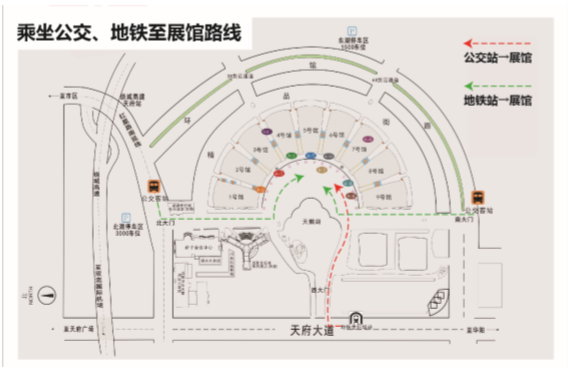 機場至展館: 乘坐地鐵10號線(新平-太平園)雙流機場2航站樓上車-太平園B口下車, 步行360米,換成84路,武陽大道三段上車-新會展中心北側下車,步行52 米到達。
